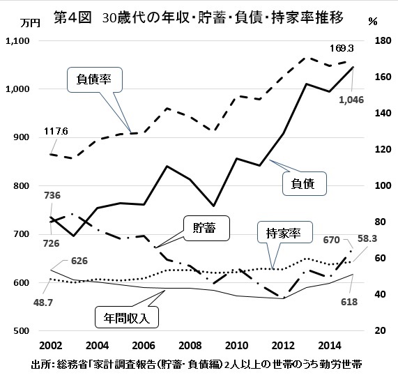 この図は非常に示唆的である。というのは、この3年は上昇しているものの年収は下落、02年水準に戻っていない。その中で貯蓄を減らしながら負債を300万円以上増やしているからである。当然負債率は上昇することになる。持ち家率が上昇しているので、恐らく住宅ローンを利用しマンションか戸建て住宅を購入したものと思われる。これらから言えることは、現役世代は恐らく貯蓄の減少もあるが、それ以上に負債の増加というリスクを背負っている可能性がある。