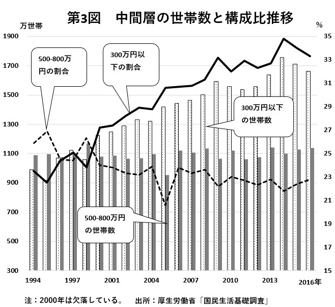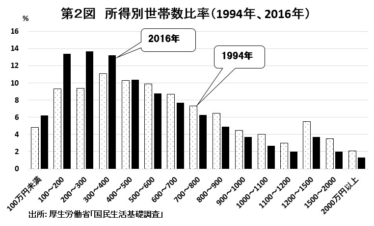 1994年と2016年の世帯所得の年収別構成比を見ると、16年は低所得者層と中間層(下)が増えているのが分かる。16年は、年収300万円以下は33%、500万円以下は57%に達する。94年に比べそれぞれ10ポイント、13ポイントも増加している。低所得者層と中間層(下)の厚みが増したのである。