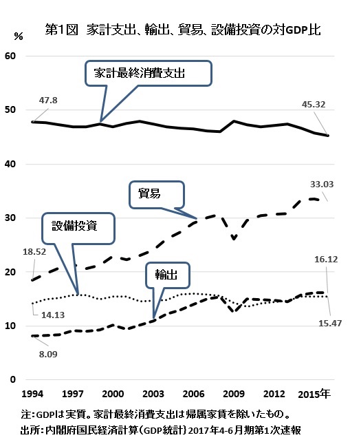 この間の特徴は個人消費の低迷である。実質GDPの家計最終消費支出(除く持ち家の帰属家賃(2))を見ると、GDPは94年の425・4兆円から16年には521・5兆円と96・1兆円(22・6%)増となっているが、家計最終消費支出は203・4兆円から236・4兆億円と約33兆円(16・2%)増にとどまっている。この結果、94年に47・8%あった家計最終消費支出のGDP比率は、16年には45・3%まで下げている。