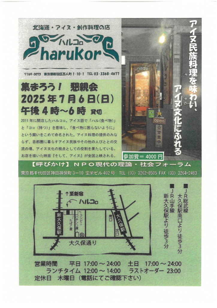 7月6日の日曜日、梅雨の合間(首都圏では梅雨明けしていない)の真夏日続きのまっただ中、「アイヌ民族料理を味わい、アイヌ文化にふれる」ハルコロ懇親・交流会が午後4時から開かれた。